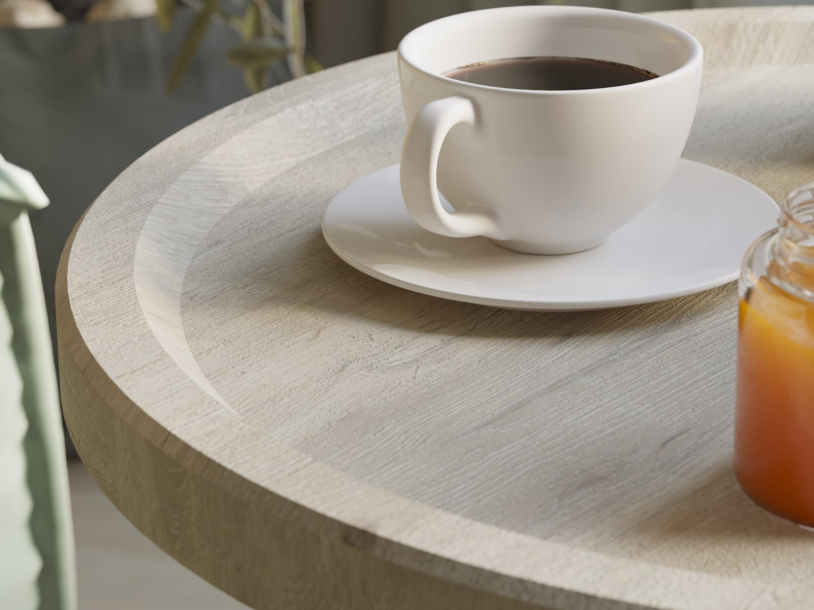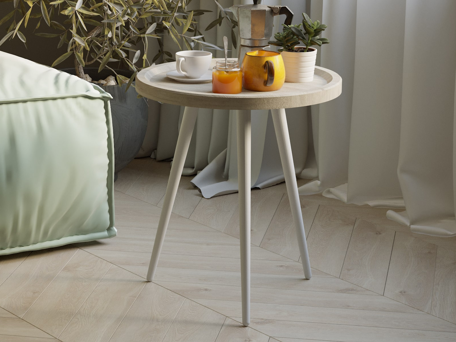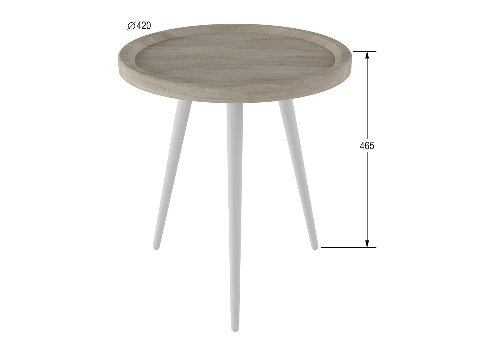 Круглая, слегка вогнутая столешница с оригинальным бортиком изготовлена из МДФ, локаничный контраст которой придают изящные опоры из натурального дерева.