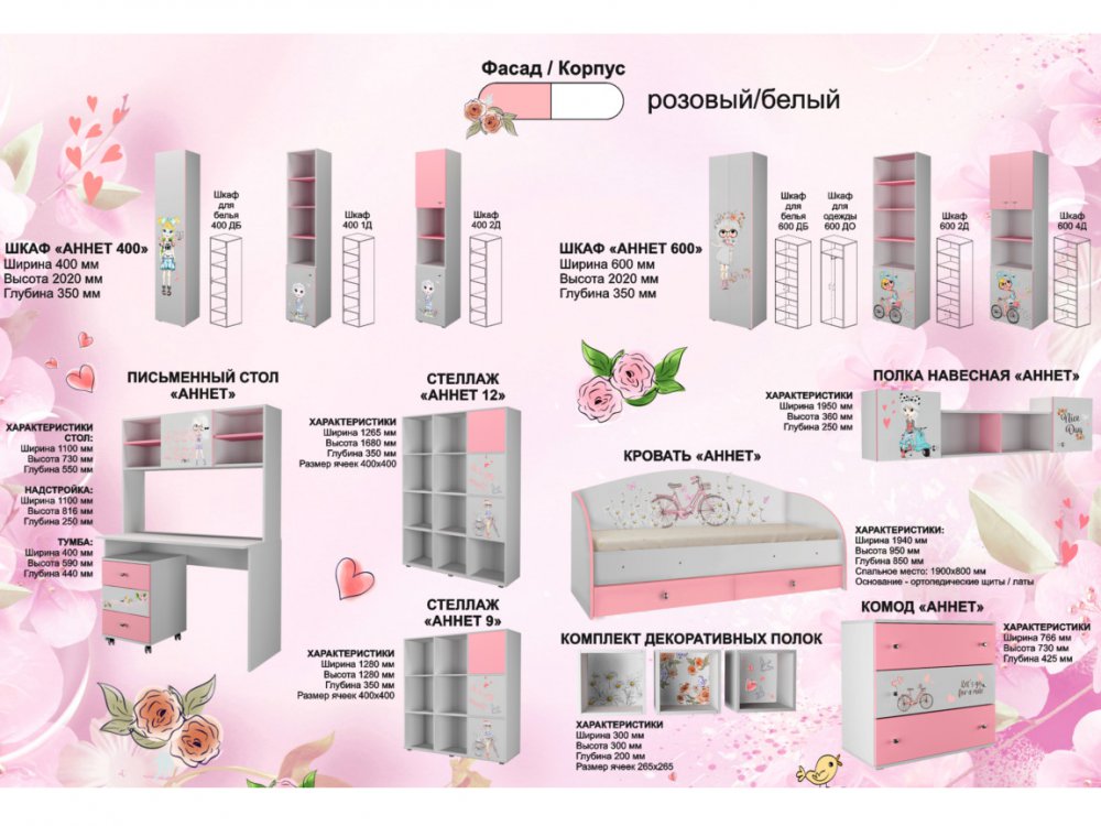 Цена указана за комплект на фото: Шкаф 400 2Д, Шкаф 600 4Д, Стол письменный, Тумба для стола выкатная, Надстройка для стола, Стеллаж ДМ 12, Дверь (3шт ) с фотопечатью, Кровать на ламелях, Полки навесные 3 шт с фотопечатью
