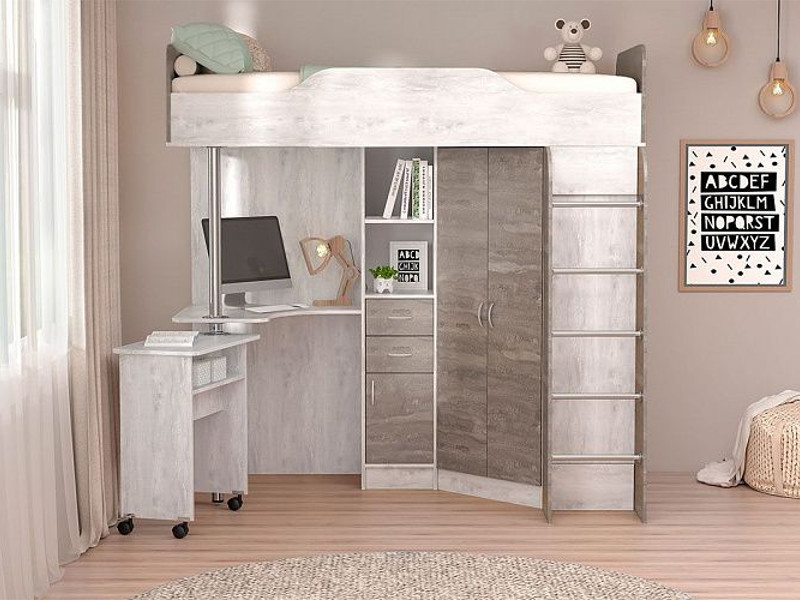 В модульную спальню входит 3 предмета мебели: кровать-чердак, шкаф и стол с выкатным модулем. Допустимая нагрузка а спальное место - до 50 кг, допустимая высота матраса - не более 120 мм.