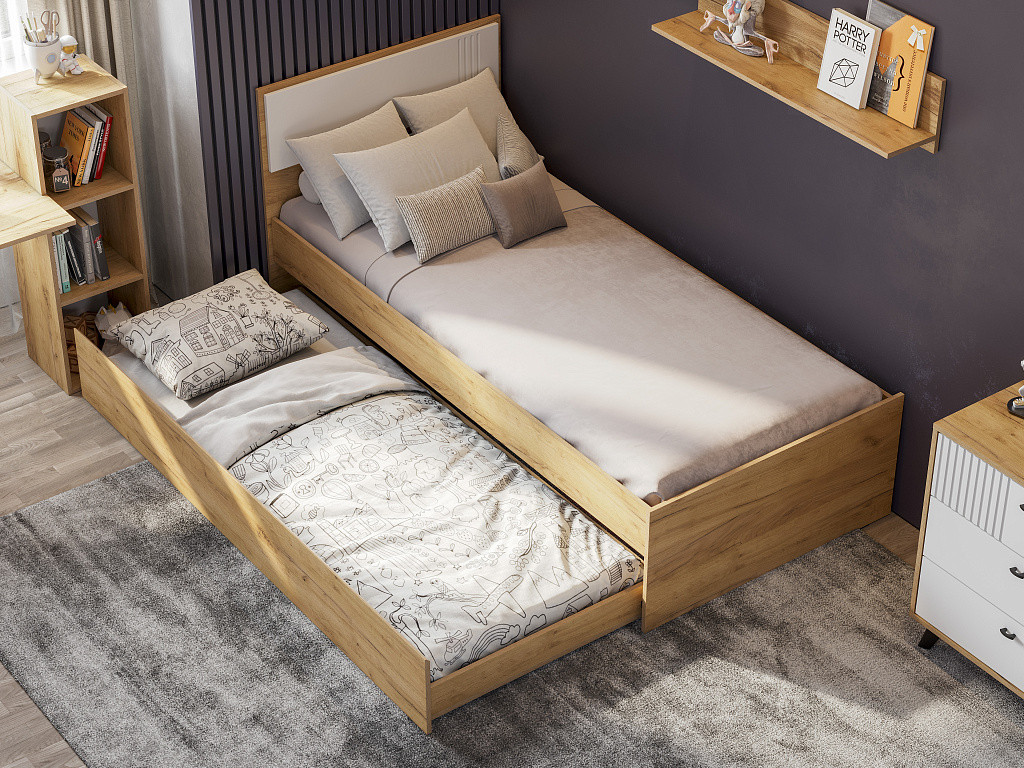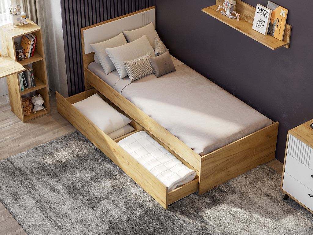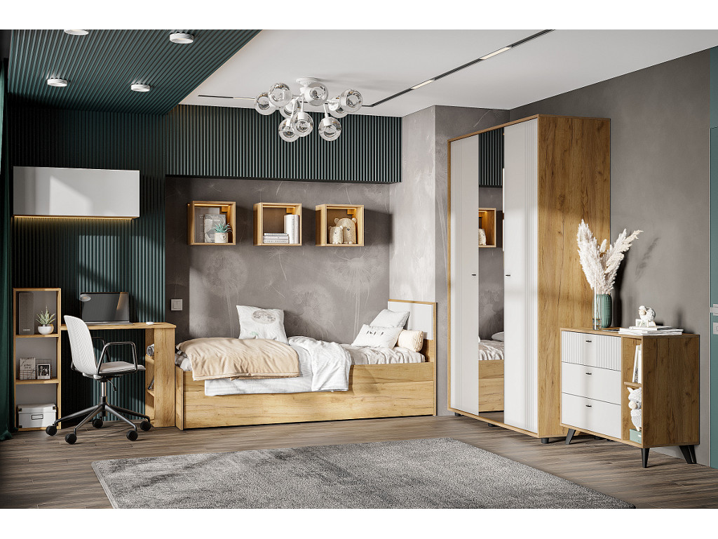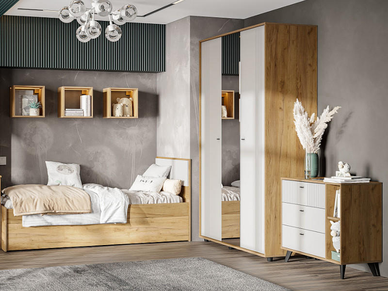 Цена за комплект: Шкаф трехстворчатый, Комод 3 ящика, Полка навесная ПЛН 5 (3шт), Кровать одинарная, Ящик для кровати, Основание под матрац 0,9*2,0м (ЛДСП)