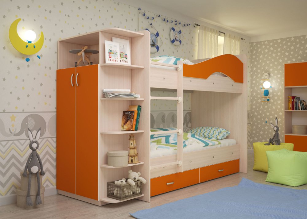 - Двухъярусная кровать со шкафом Мая латофлексы оранжевый