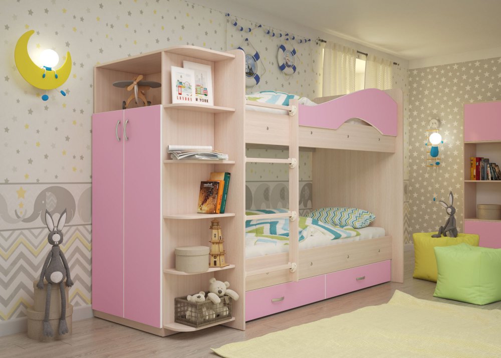 - Двухъярусная кровать со шкафом Мая щиты розовый