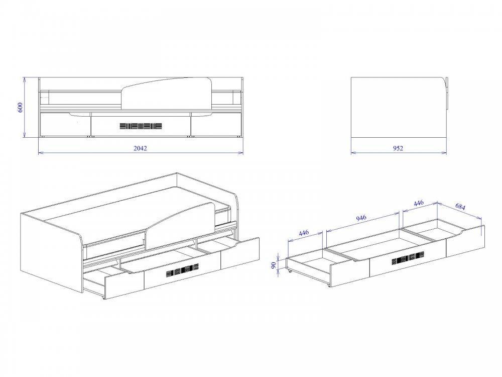 В кровати Мале расположены три бельевых ящика на выкатных роликах.