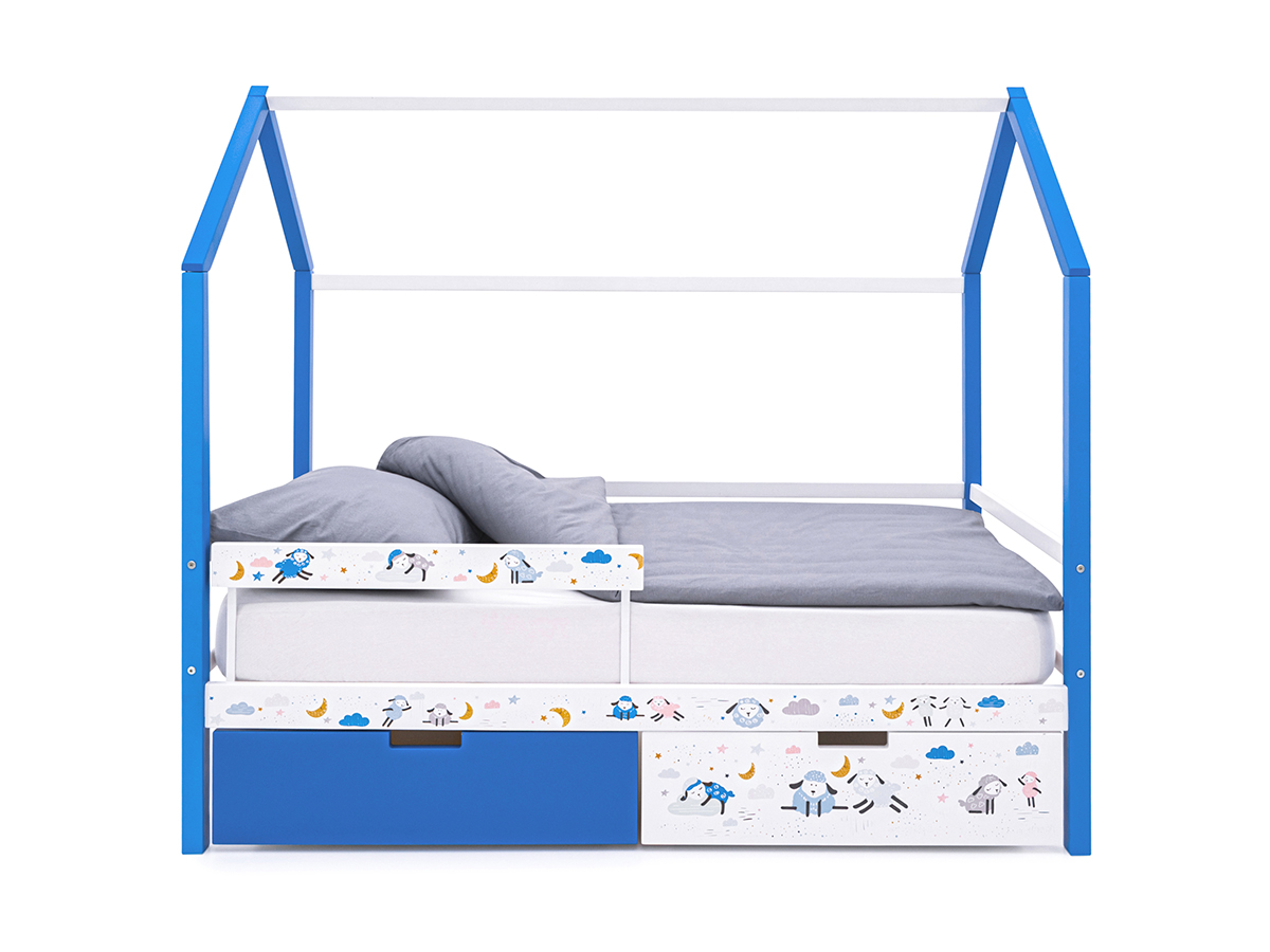 Кровать-домик Svogen с фото с ящиками и бортиком синий/барашки