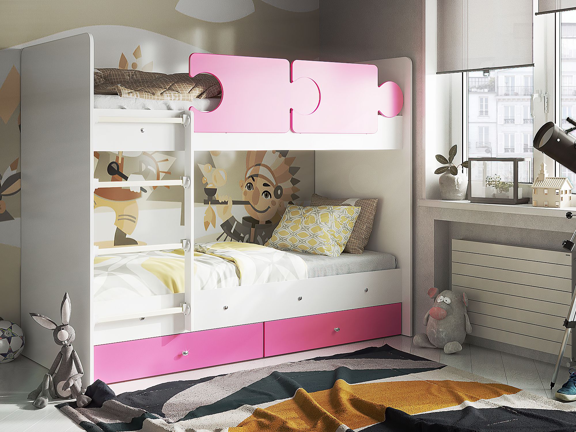 - Кровать двухъярусная Тетрис латы с бортиками белый-розовый