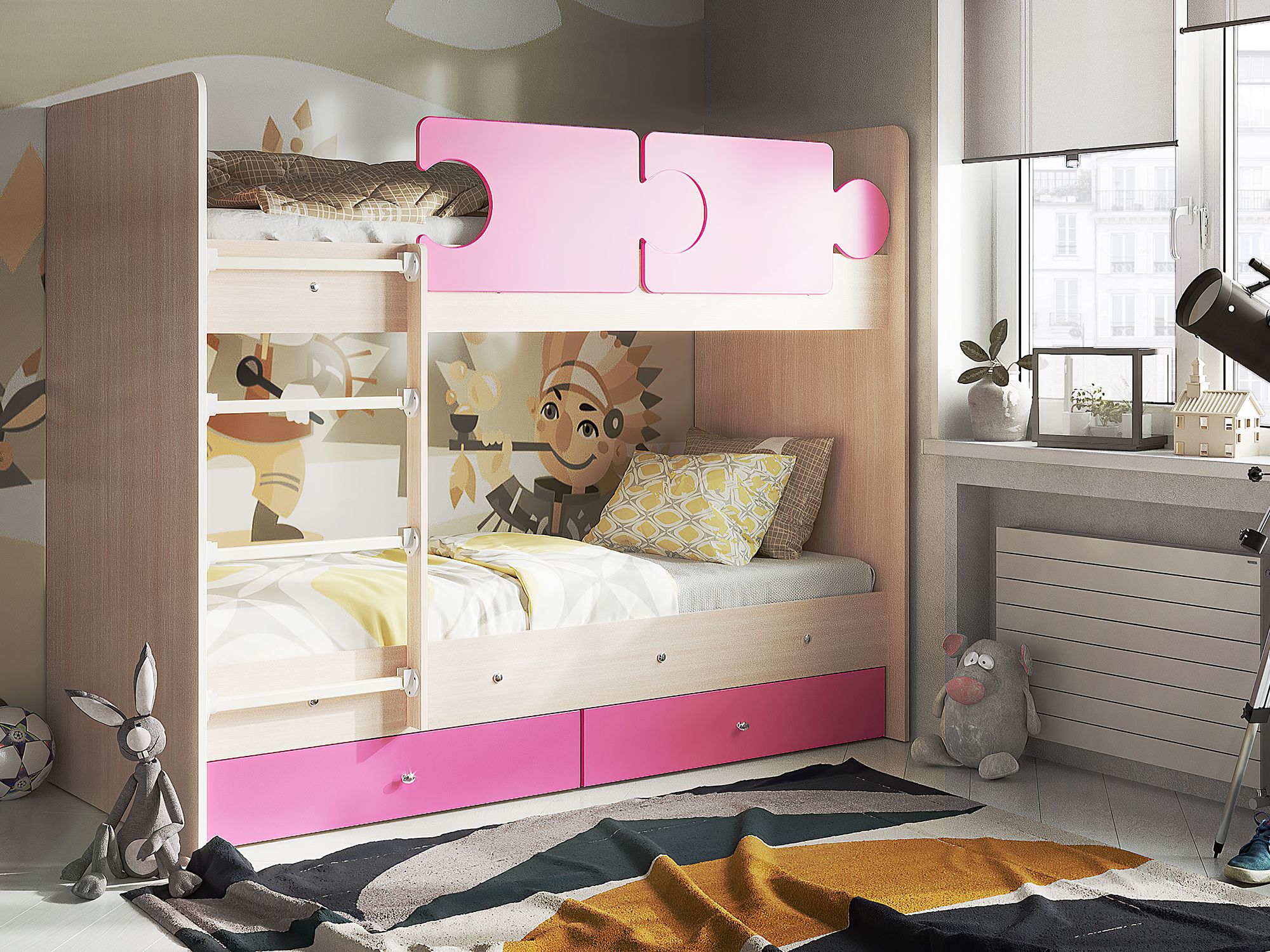 - Кровать двухъярусная Тетрис латы с бортиками дуб млечный-розовый