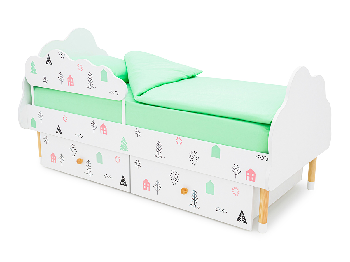 Кровать Stumpa Облако бортик и ящики рисунок Домики розовый, бирюзовый