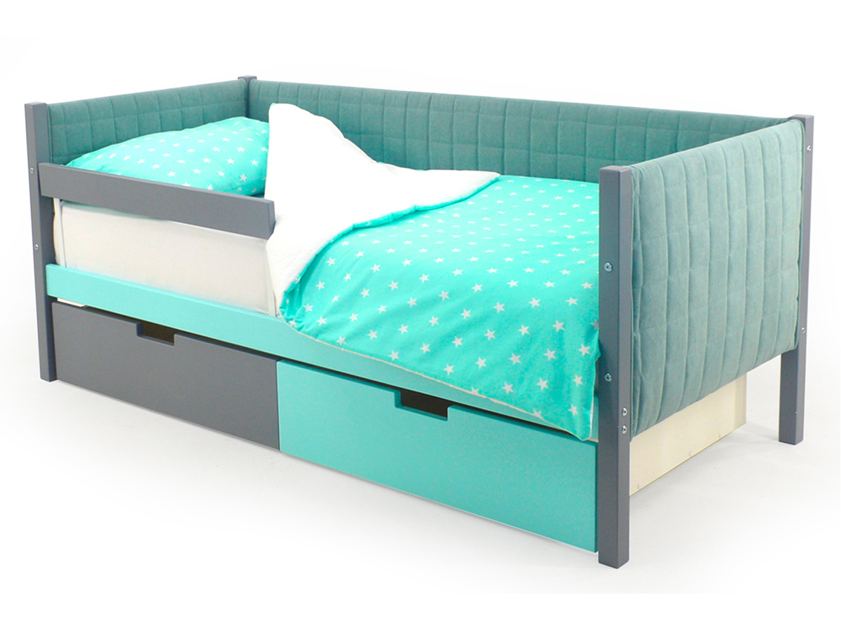 Кровать-тахта мягкая Svogen с ящиками и бортиком графит-мятный