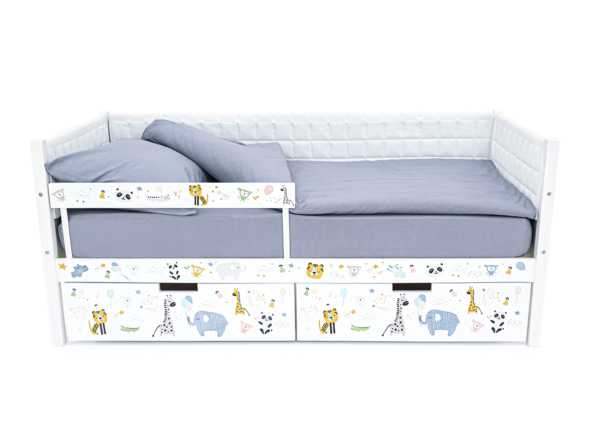 Кровать-тахта Svogen мягкая с ящиками и бортиком с фото белый/зверята