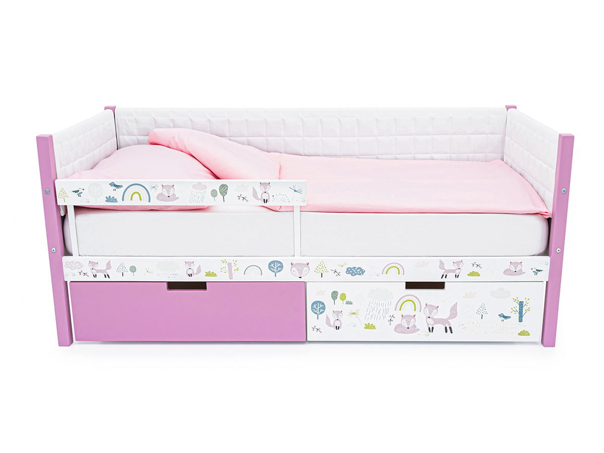 Кровать-тахта Svogen мягкая с ящиками и бортиком с фото лаванда/лисята