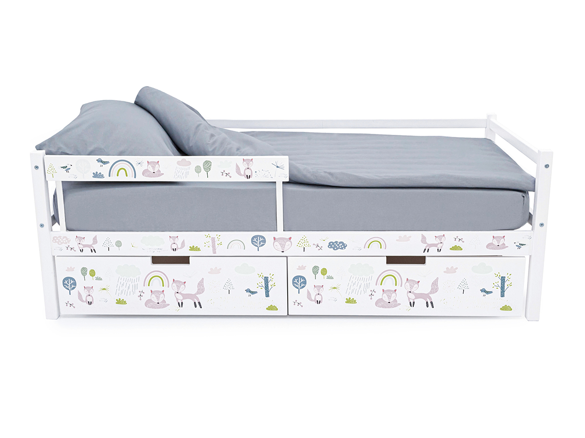 Кровать-тахта Svogen с ящиками и бортиком с фотопечатью белый/лисята