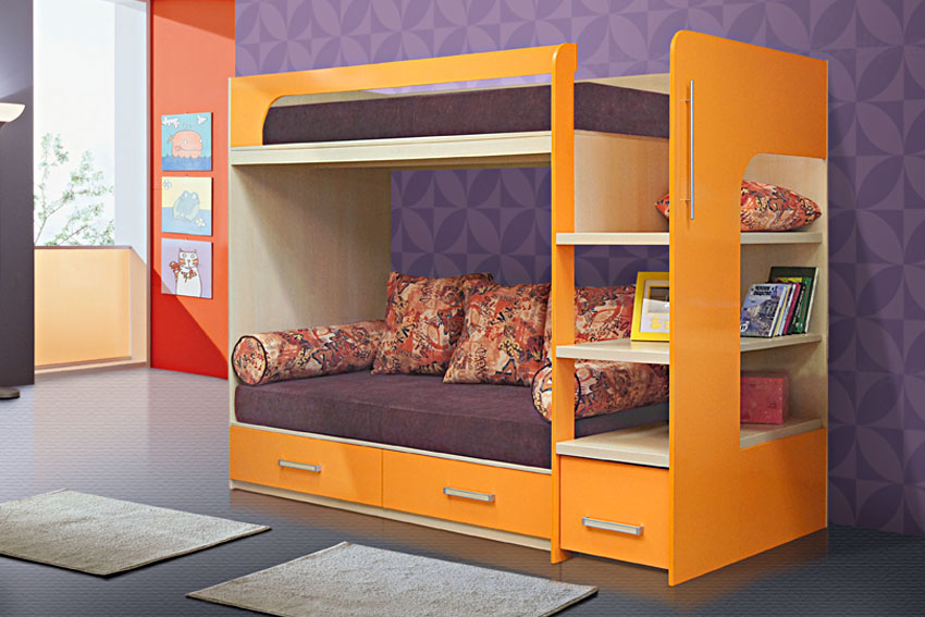 Оригинальное исполнение кровати - на нижнем ярусе расположен диван, на верхнем ярусе кровать. Удобный вариант для подростков, которые любят приглашать друзей и при этом поддерживать порядок в комнате.
