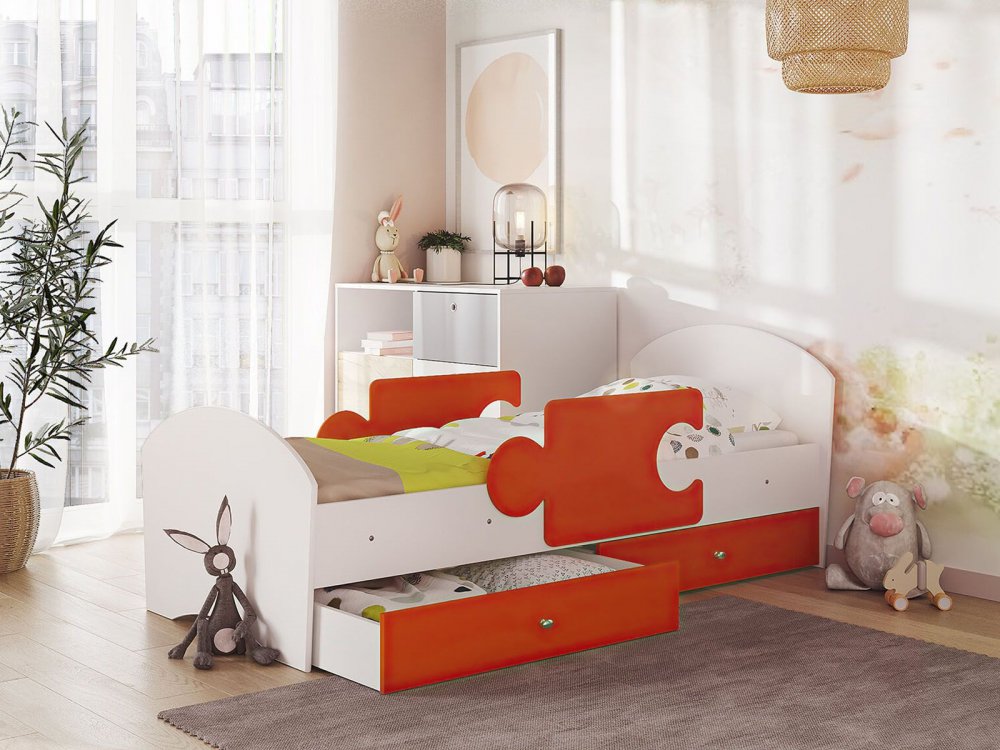 - Кровать Мозаика с бортиками и ящиком белый с оранжевым