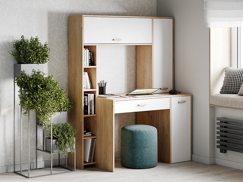 Внутреннее пространство стола разделено на 3 закрытых зоны: правая зона оснащена 1 съемной и 3 жесткими полками. Левая зона представлена в виде открытой ниши с полками. Верхнее отделение разделено на 2 части перегородкой. Под столешницей расположен ящик на шариковых направляющих.
