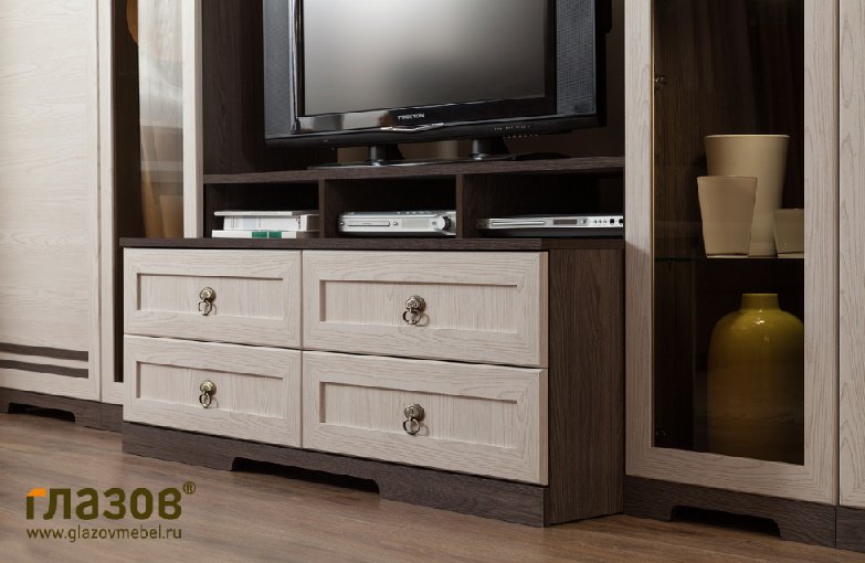 Гостиная БРИЗ — для ценителей стилей Прованс и Шебби-шик. Седой серо-коричневый оттенок корпуса Ясень Анкор темный создает в интерьере сентиментальный шарм «потертых» вещей. Его уравновешивает нежный сливочный оттенок фасадов — Бодега светлый.