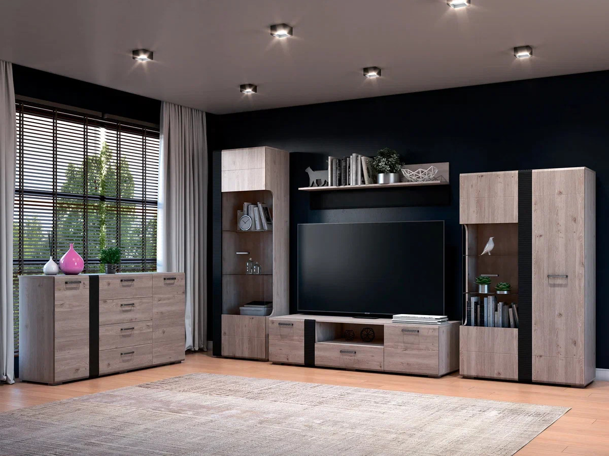 Цена за комплект: комод 4ящика+2двери, полка навесная, тумба ТВ, Шкаф с витриной 1дверь, Шкаф с витриной 2двери
