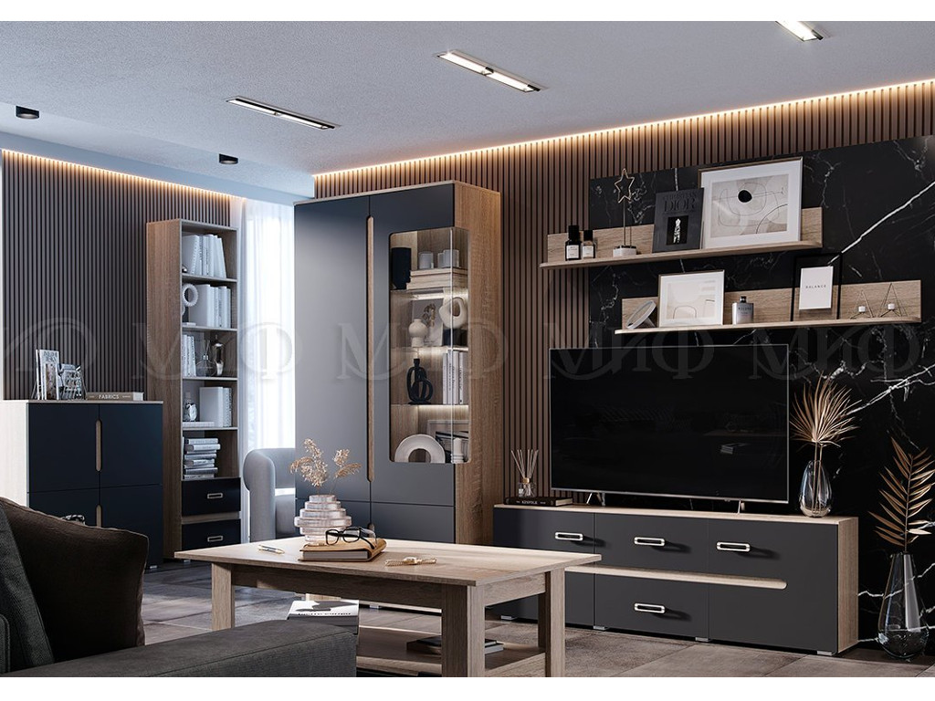 Цена за комплект: Шкаф с подсветкой, Полки, Тумба 4-х створчатая, Тумба ТВ, Пенал открытый
