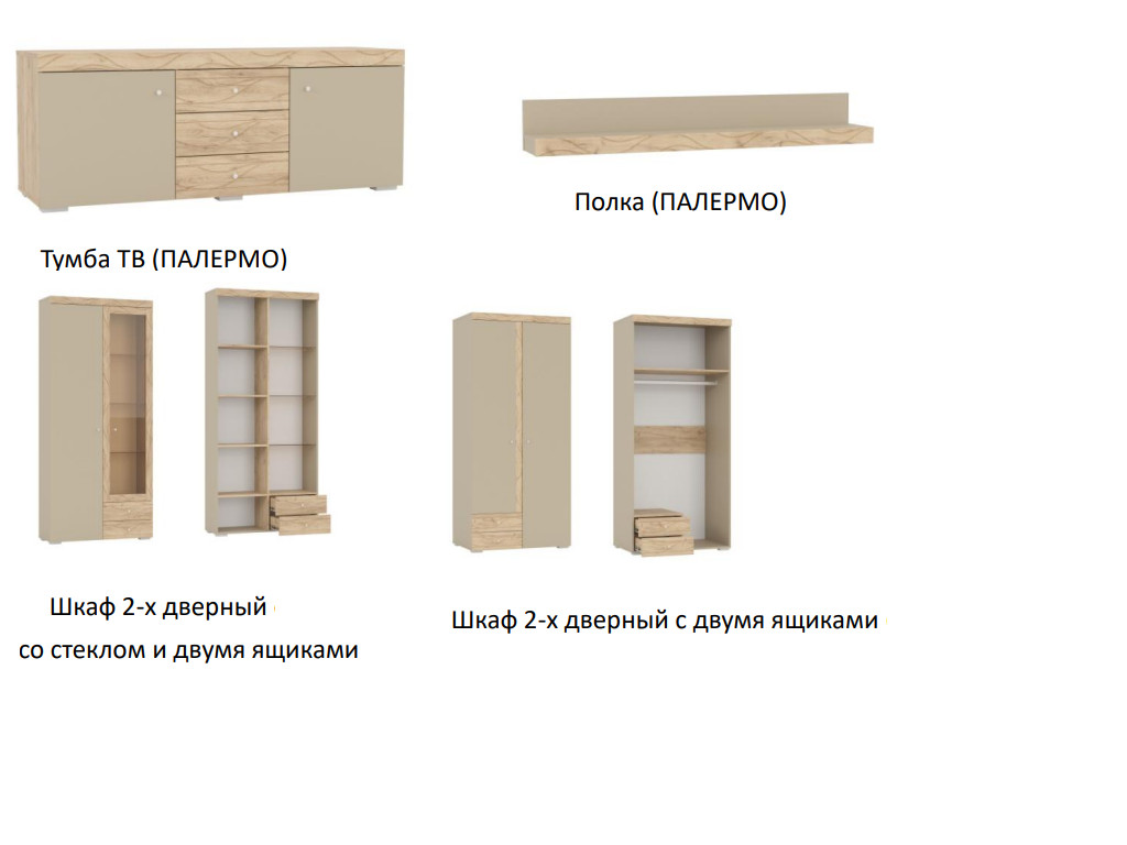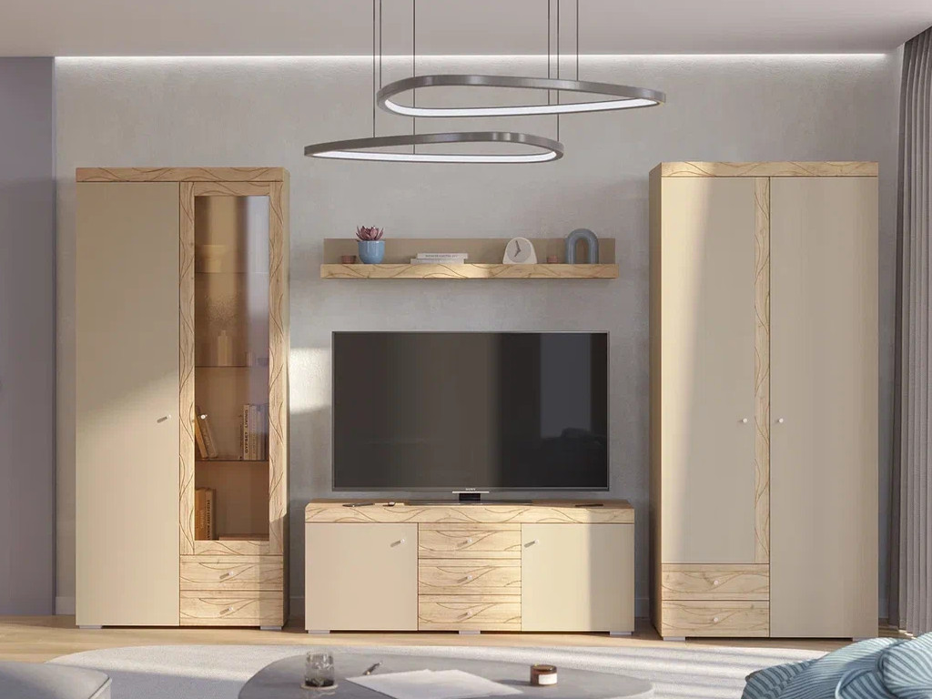 Цена за комплект: Тумба ТВ, Шкаф 2-х дверный со стеклом, Шкаф 2-х дверный, Полка
