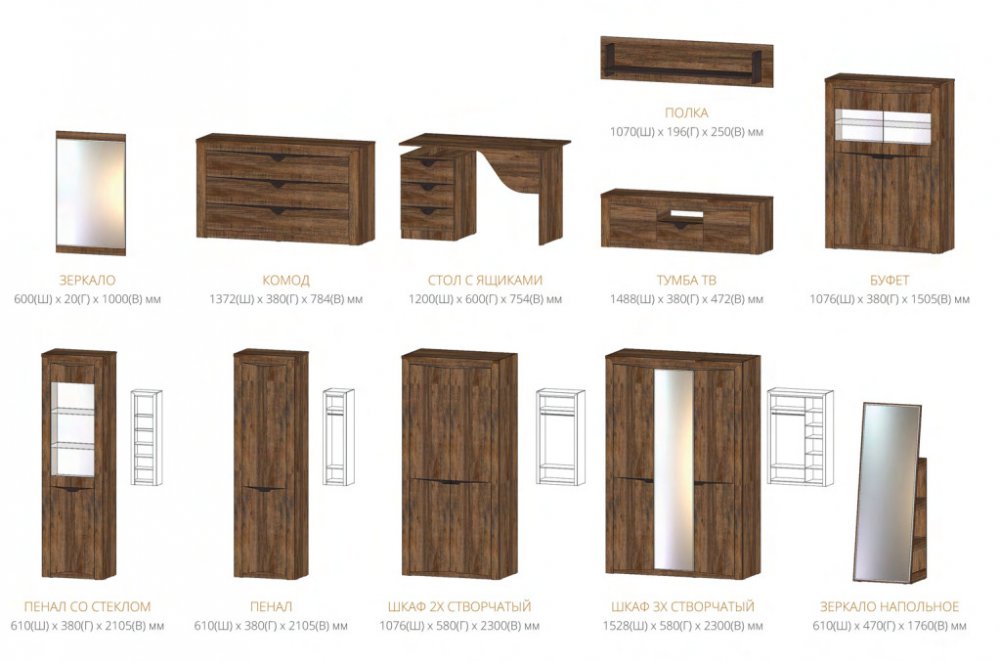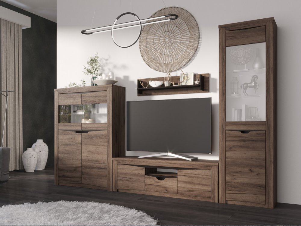 Цена указана за комплектацию на фото: Полка, Тумба ТВ, Пенал со стеклом, Буфет