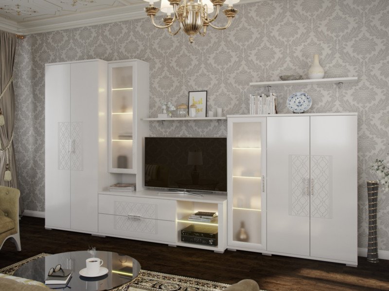 Цена за комплект: М01 шкаф двухдверный, М03 тумба под ТВ, М04 пенал-надстройка, М02 сервант, М05 полка навесная, М06 полка навесная