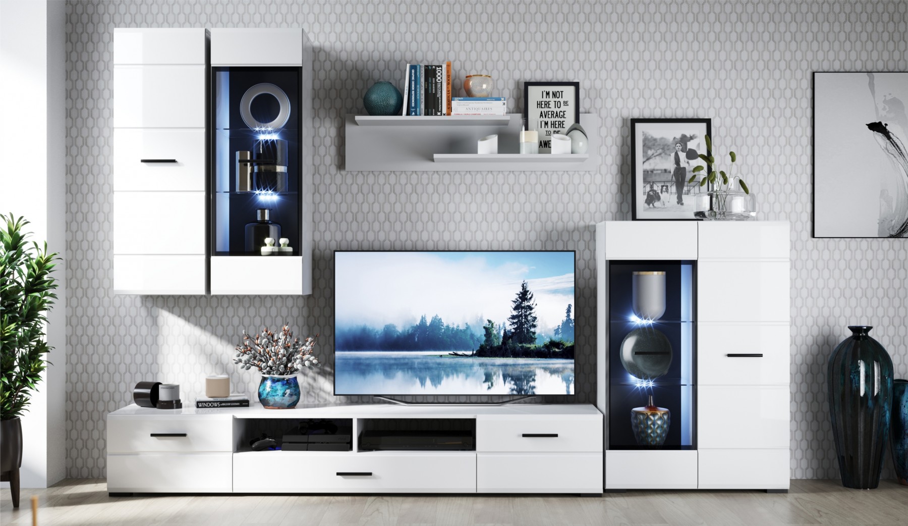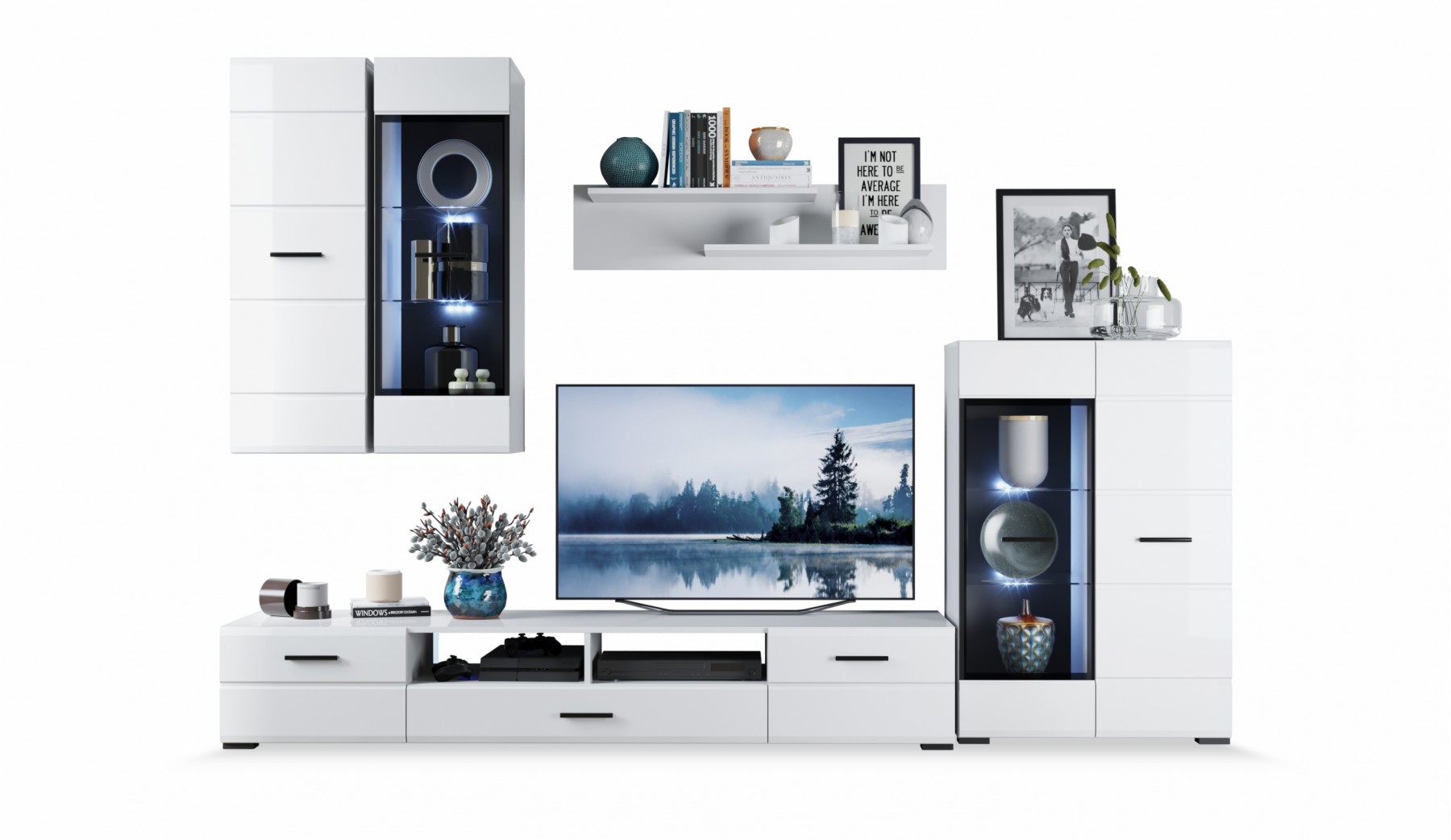 Гостиная модульная, комплектуется по вашему выбору. Цена за комплект на главном фото - полка навесная, комод, тумба ТВ 2д1я, пенал, пенал-витрина 02