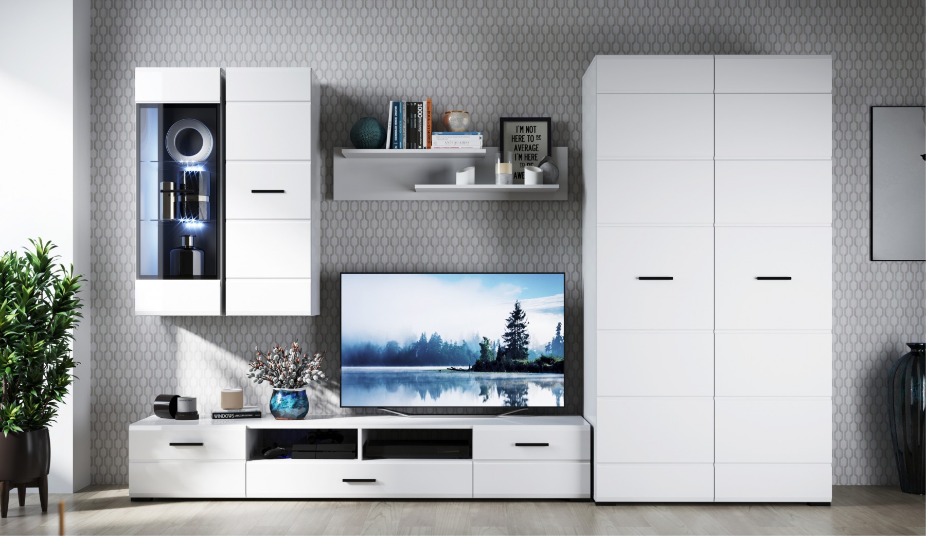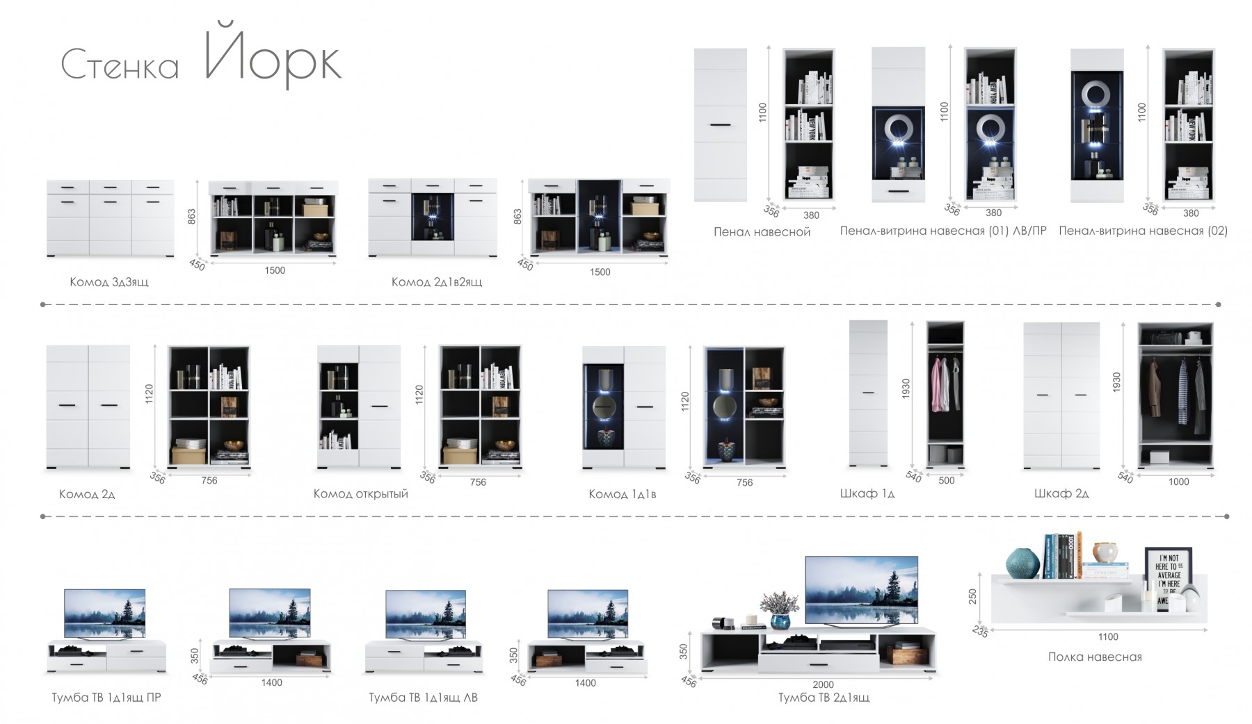 Гостиная модульная, комплектуется по вашему выбору. Цена за комплект на главном фото - шкаф 2 дверный, полка навесная, тумба ТВ 2д 1я, пенал витрина 02, пенал навесной