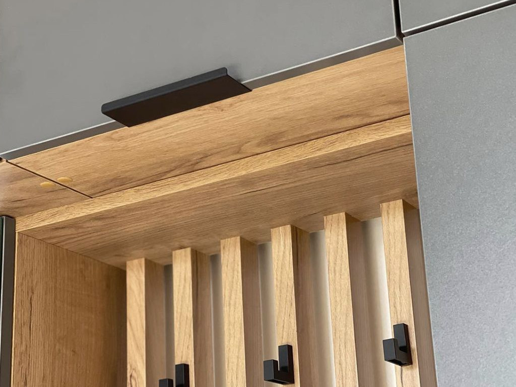 Стильные, трендовые рейки МДФ, акцентные крючки, зеркало, в котором можно себя увидеть в полный рост, полки для мелочей и головных уборов, а так же внузу большой шкаф для обуви, самые актуальные и ценные моменты для прихожей.