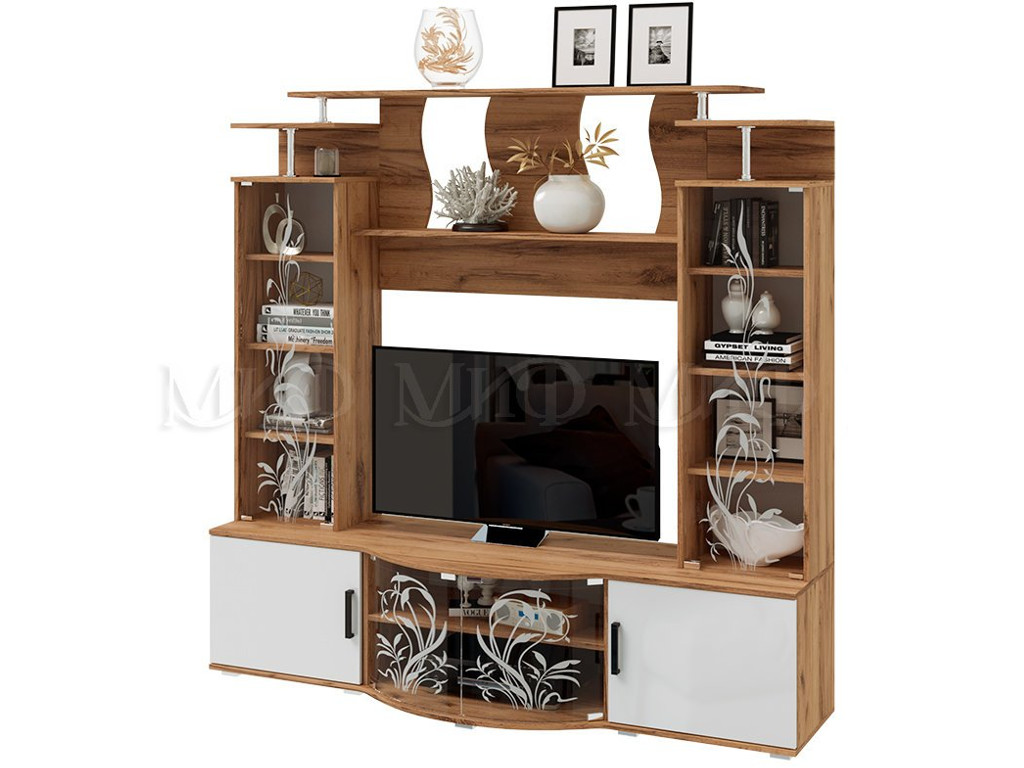 Стеклянные дверцы стеллажей декорированы растительным узором. Роскошный вариант для стильного интерьера гостиной комнаты.