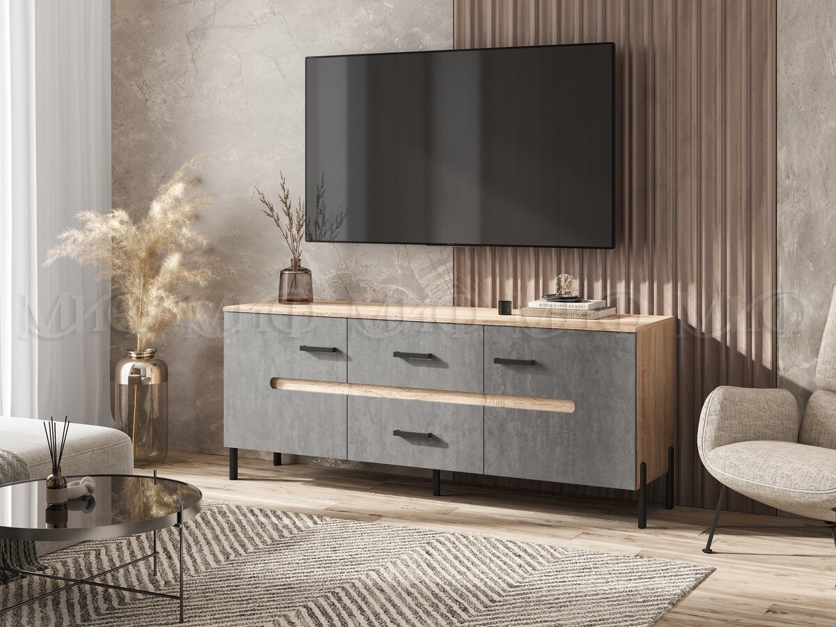 - Тумба ТВ (металл) Ким Бетон Темный, Дуб Сонома