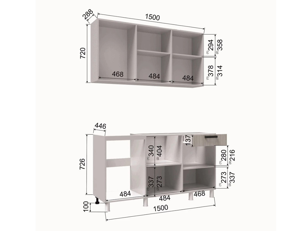 - Высота верхних шкафов, мм 720