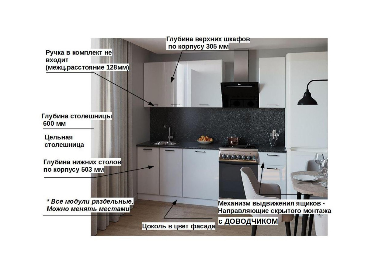 Кухонная мойка, стеновая панель, посудосушитель, планки для столешницы в комплект не входят.