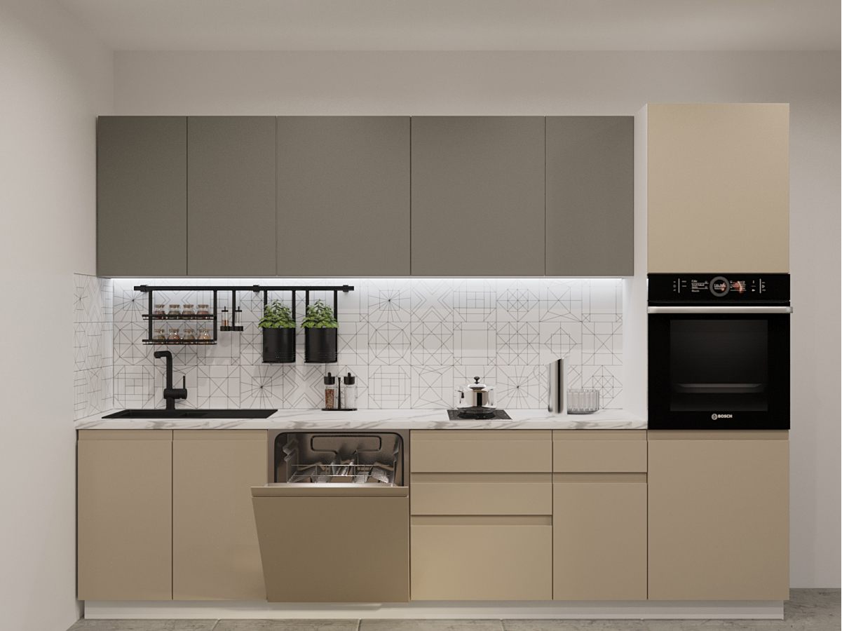 Кухонная мойка, стеновая панель, посудосушитель, планки для столешницы в комплект не входят.