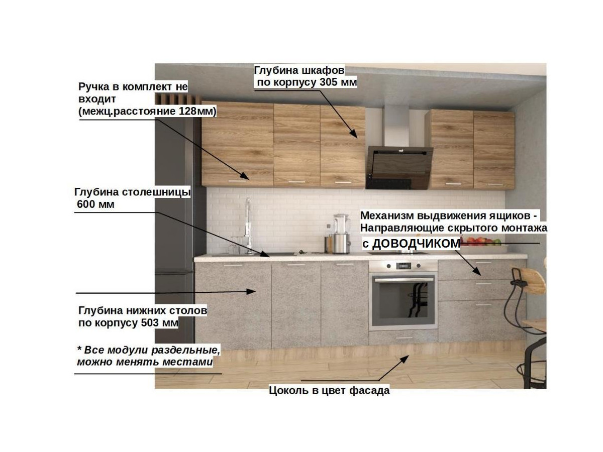 Кухонная мойка, стеновая панель, посудосушитель, планки для столешницы в комплект не входят.