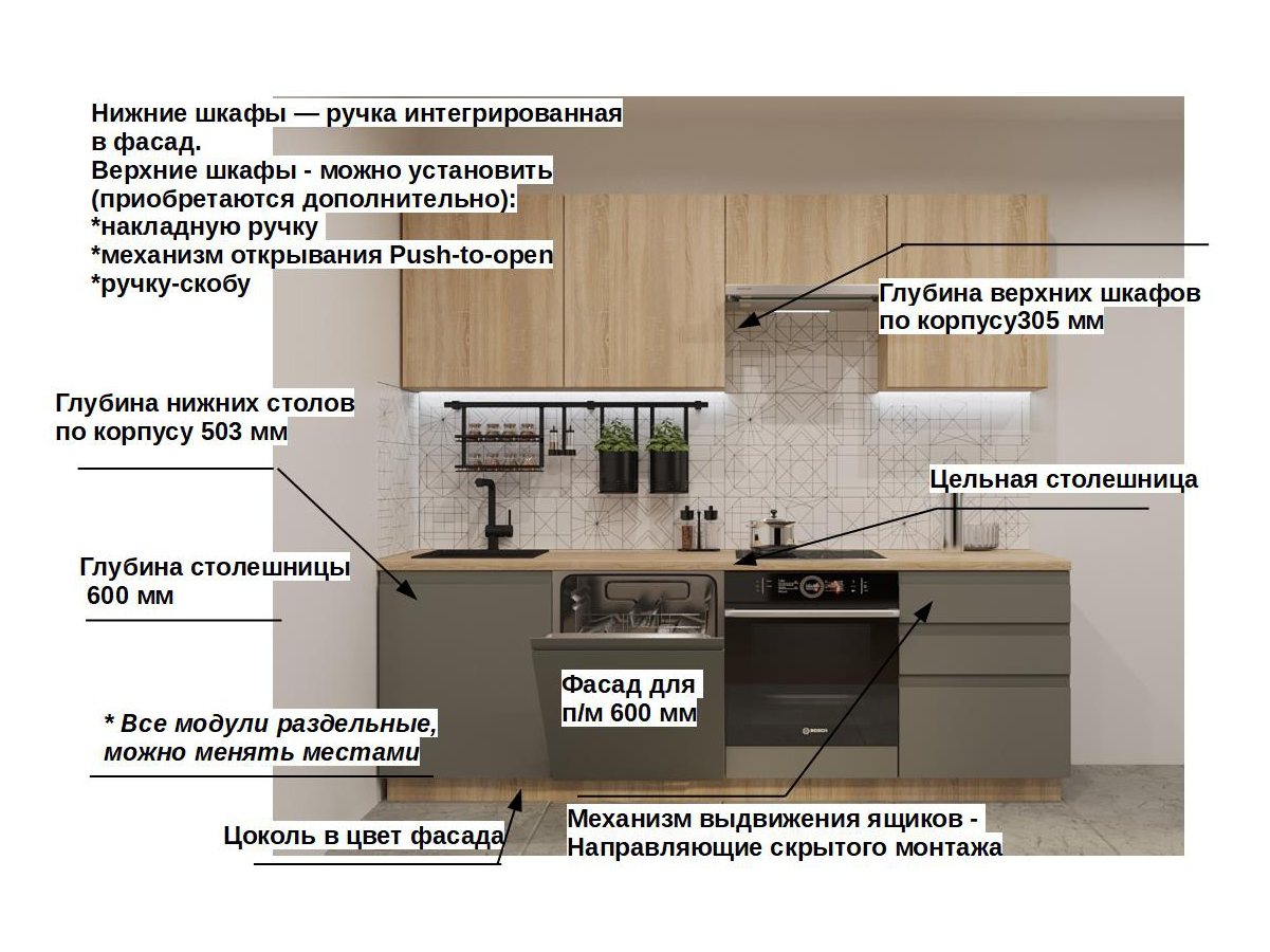 Кухонная мойка, стеновая панель, посудосушитель, планки для столешницы в комплект не входят.