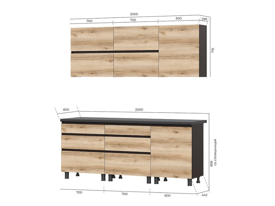• Низ (с учетом высоты столешницы) 2000х858х600мм