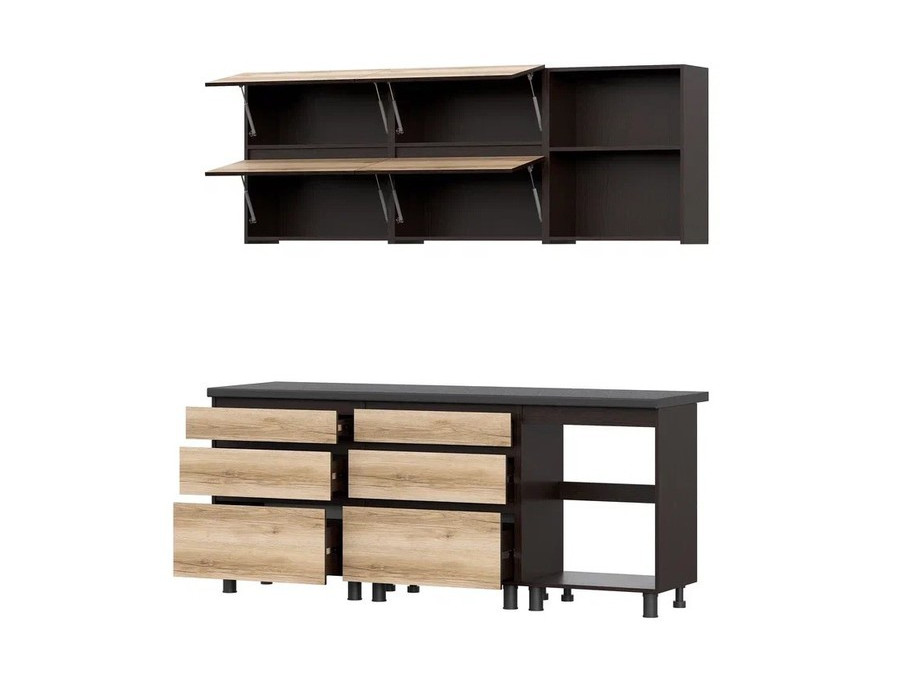 Трендовое сочетание декоров. Комбинация сложного древесного спила дуба орехового оттенка с глубоким венге подчеркивается ультра черными декорами столешницы и опор.