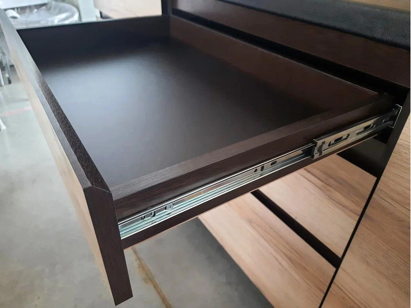 Продуманная система хранения нижних ящиков разделочного стола. Два нижних модуля оборудованы тремя выкатными ящиками на шариковых направляющих полного выдвижения, что позволяет хранить кухонную утварь эргономично и по габаритам. Два верхних модуля с подъемными створками на газлифтах обеспечивают раздельное хранение продуктов и кухонного инвентаря. Верхний модуль шириной 600 мм с распашной створкой замыкает ключевую функцию кухонного гарнитура – хранение посуды.
