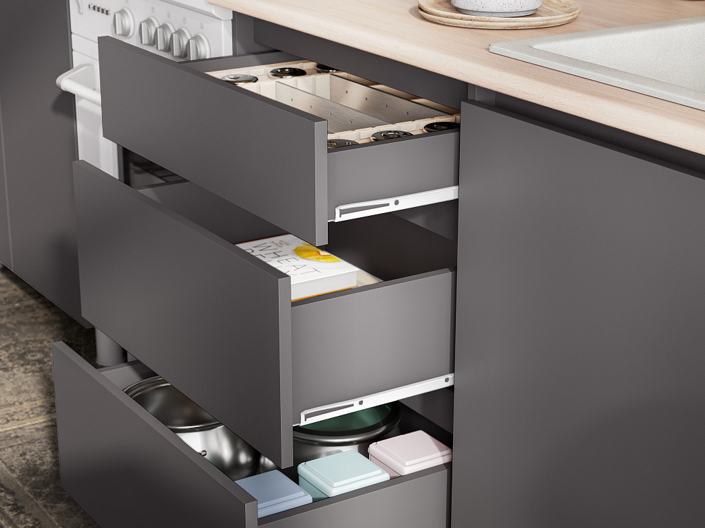 - Направляющие ящиков — роликовые.