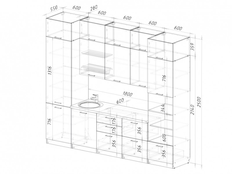 Мойка, смеситель, стеновая панель и посудосушитель в комплект гарнитура не входят.