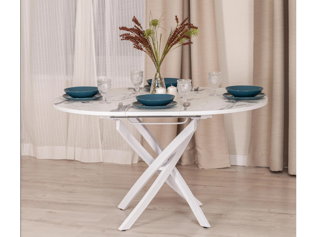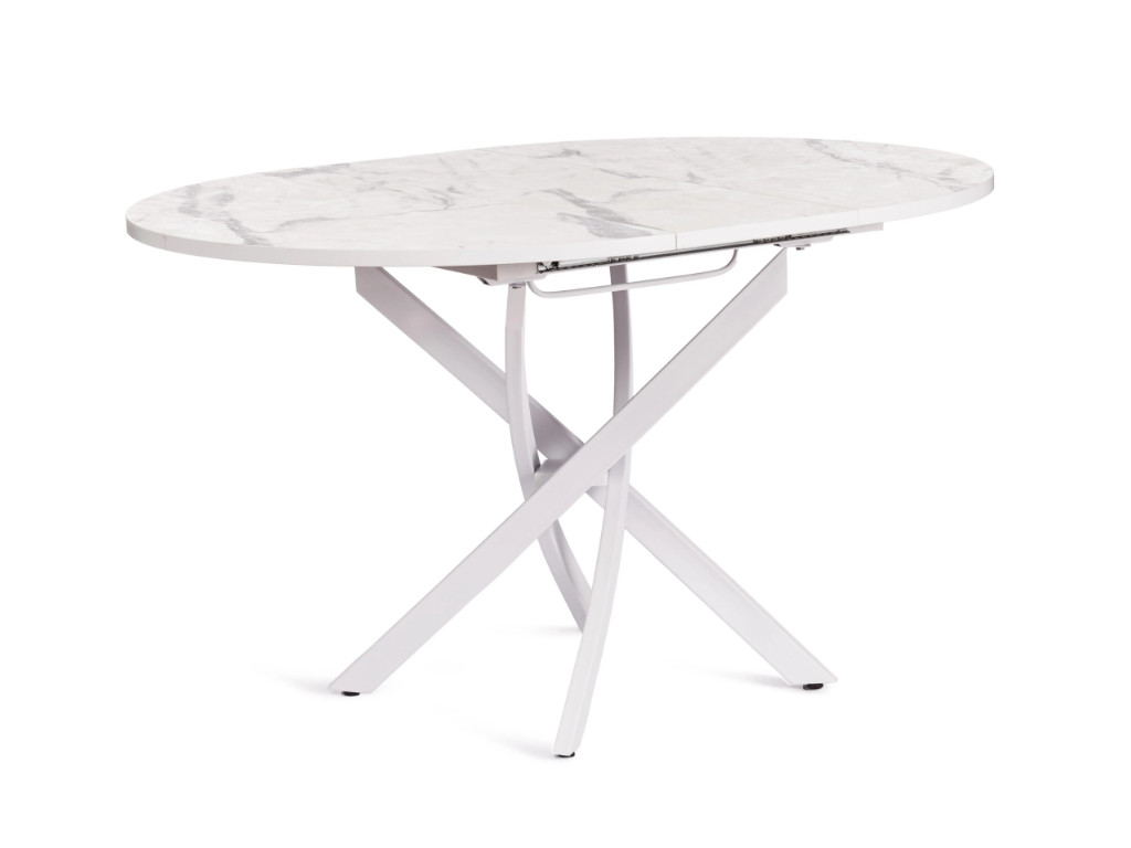 Столешница цвета Мрамор светлый и вставка «бабочка» выполнены из ЛДСП толщиной 22 мм на лицевую поверхность которых нанесен защитный слой HPL толщиной 1 мм. HPL имеет защитное покрытие оверлей высокой степени истирания, которое повышает устойчивость поверхностей к повреждениям. Механизм раздвижения синхронный со вставкой "бабочка". Кромка столешницы оклеена высокопрочной пленкой из ПВХ толщиной 2 мм. Каркас стола выполнен из ЛДСП толщиной 16 мм. Стильные изогнутые металлические ножки окрашены порошковой краской. Устойчивые ножки стола регулируются по высоте для устранения неровности пола. За столом могут разместиться от 2 до 6 человек. Стол прост в сборке, инструкция по сборке прилагается.