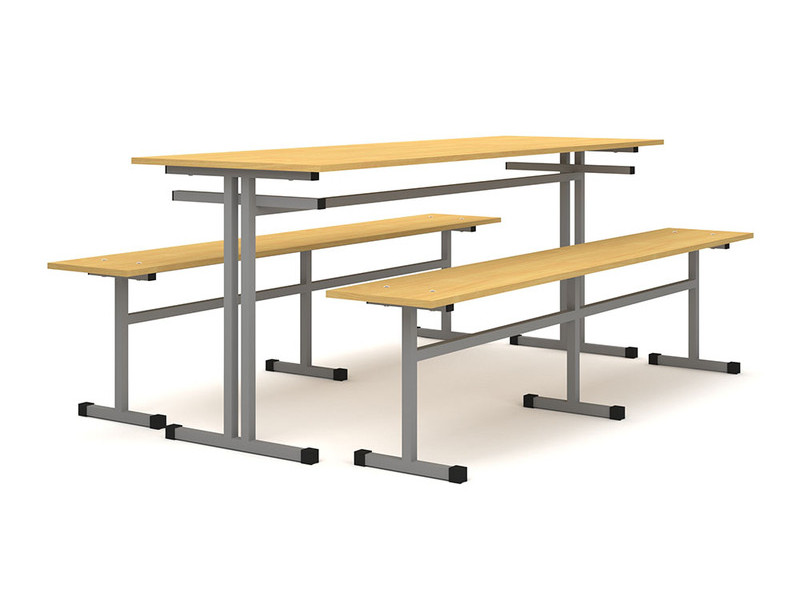 Стол обеденный 6-ти местный, оборудованный двумя скамьями. Каркас изготовлен из металлической трубы квадратного сечения 25х25 мм, с полимерно-порошковой окраской в светло-серый цвет.