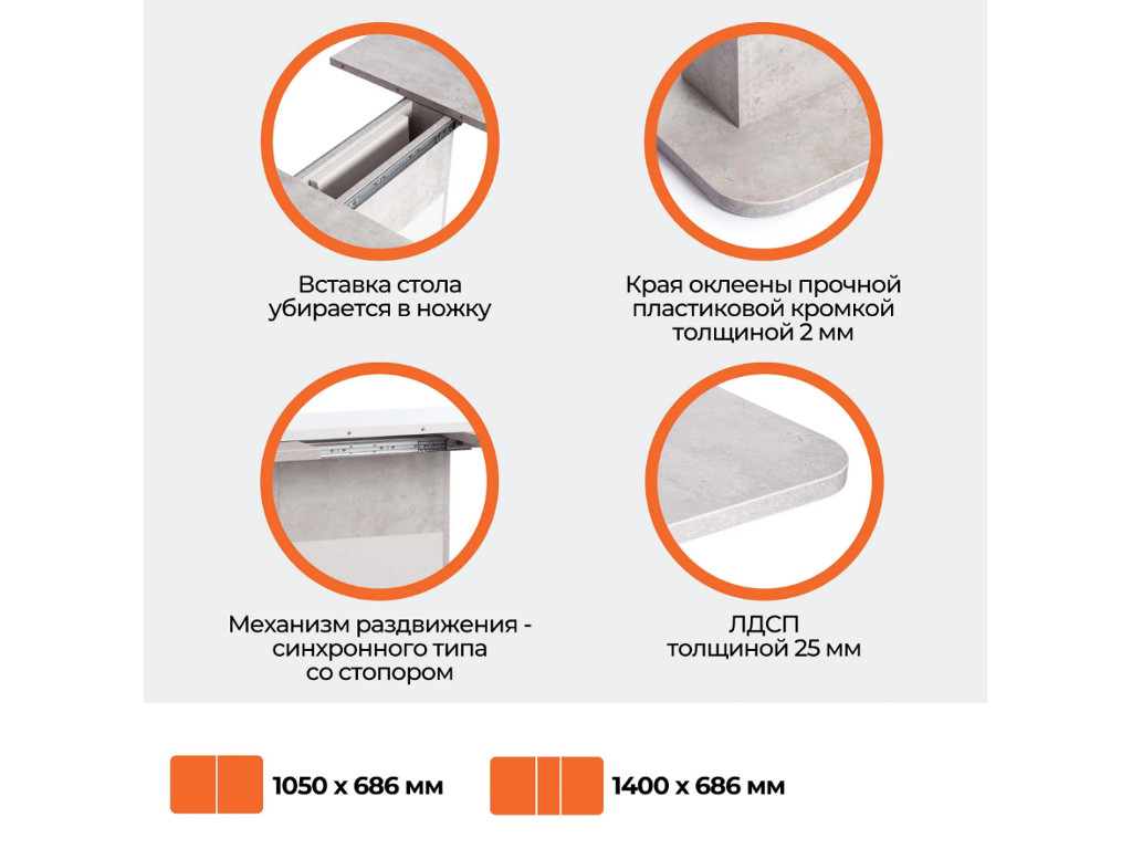 Прямоугольная столешница из ЛДСП толщиной 25 мм и оригинальная ножка-опора. Края стола оклеены прочной пластиковой кромкой толщиной 2 мм, что значительно продлит срок его службы. При необходимости можно быстро и легко увеличить размеры стола с помощью центральной секции, для этого используется механизм синхронного типа со стопором. Вставка стола легко убирается в ножку. За столом с комфортом могут разместиться от 4 до 6 человек.