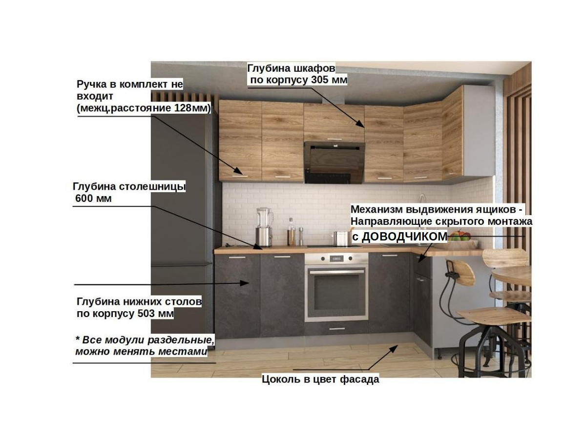 Кухонная мойка, стеновая панель, посудосушитель, планки для столешницы в комплект не входят.