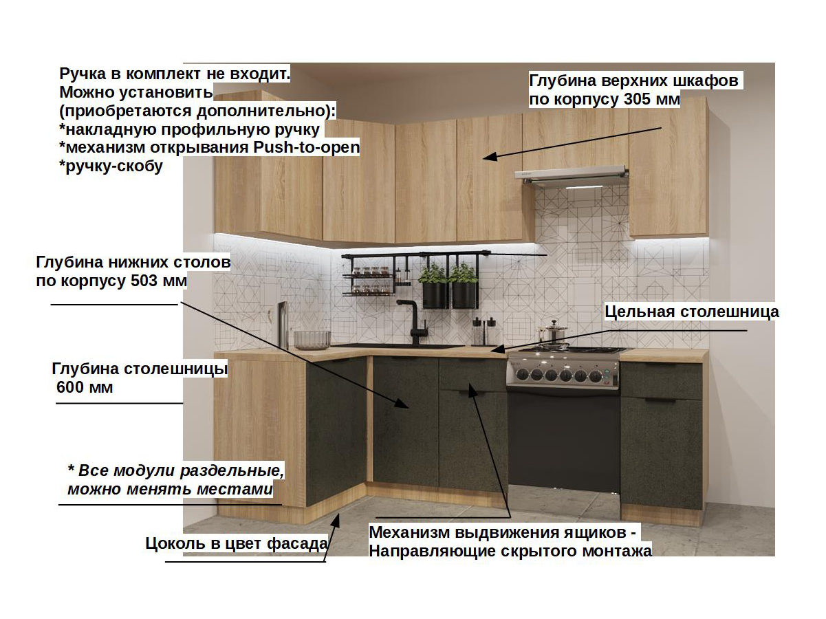 Кухонная мойка, стеновая панель, посудосушитель, планки для столешницы в комплект не входят.