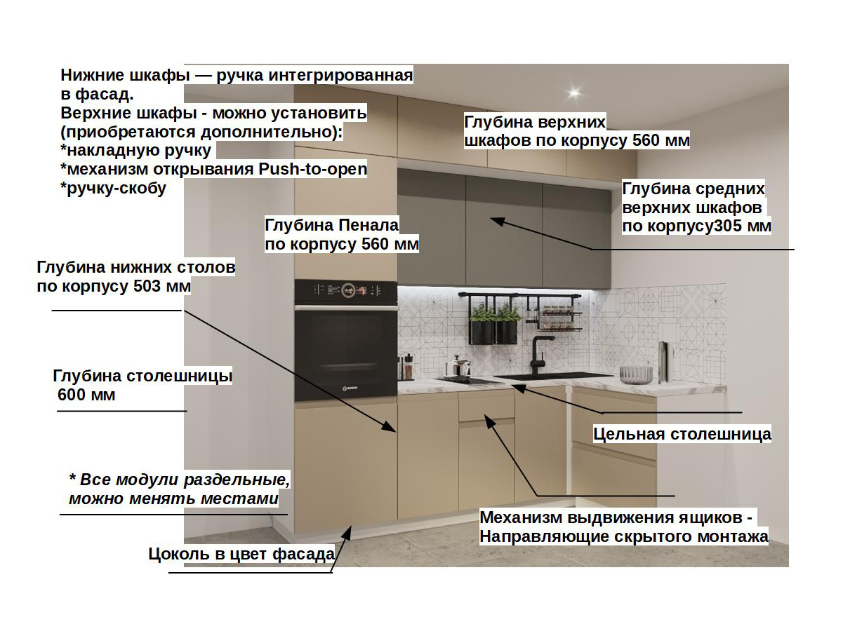 Кухонная мойка, стеновая панель, посудосушитель, планки для столешницы в комплект не входят.