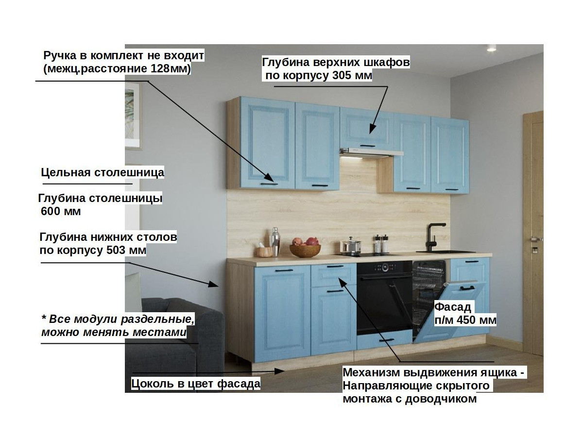 Кухонная мойка, стеновая панель, посудосушитель, планки для столешницы в комплект не входят.