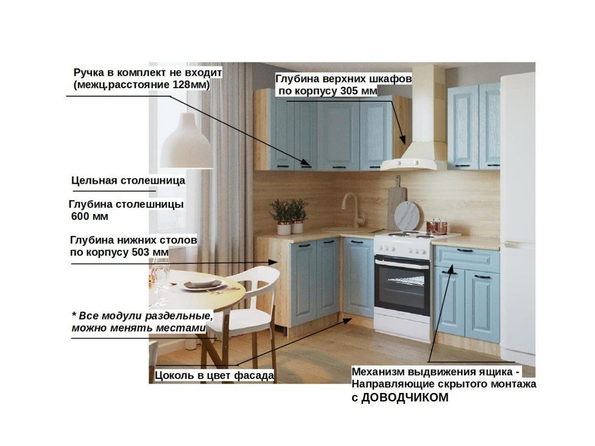 Кухонная мойка, стеновая панель, посудосушитель, планки для столешницы в комплект не входят.