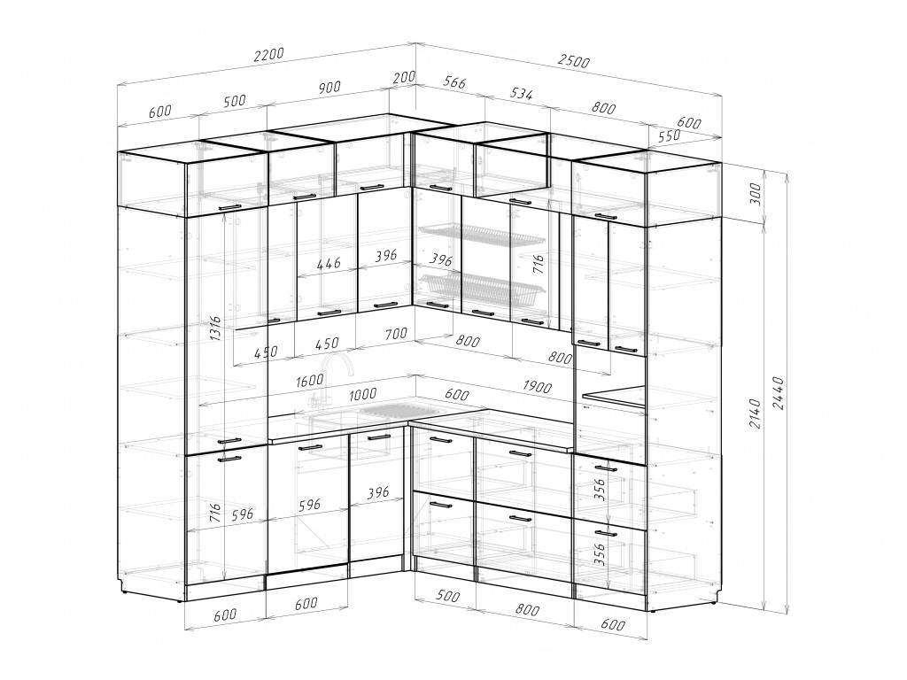 Мойка, смеситель, стеновая панель и посудосушитель в комплект гарнитура не входят.