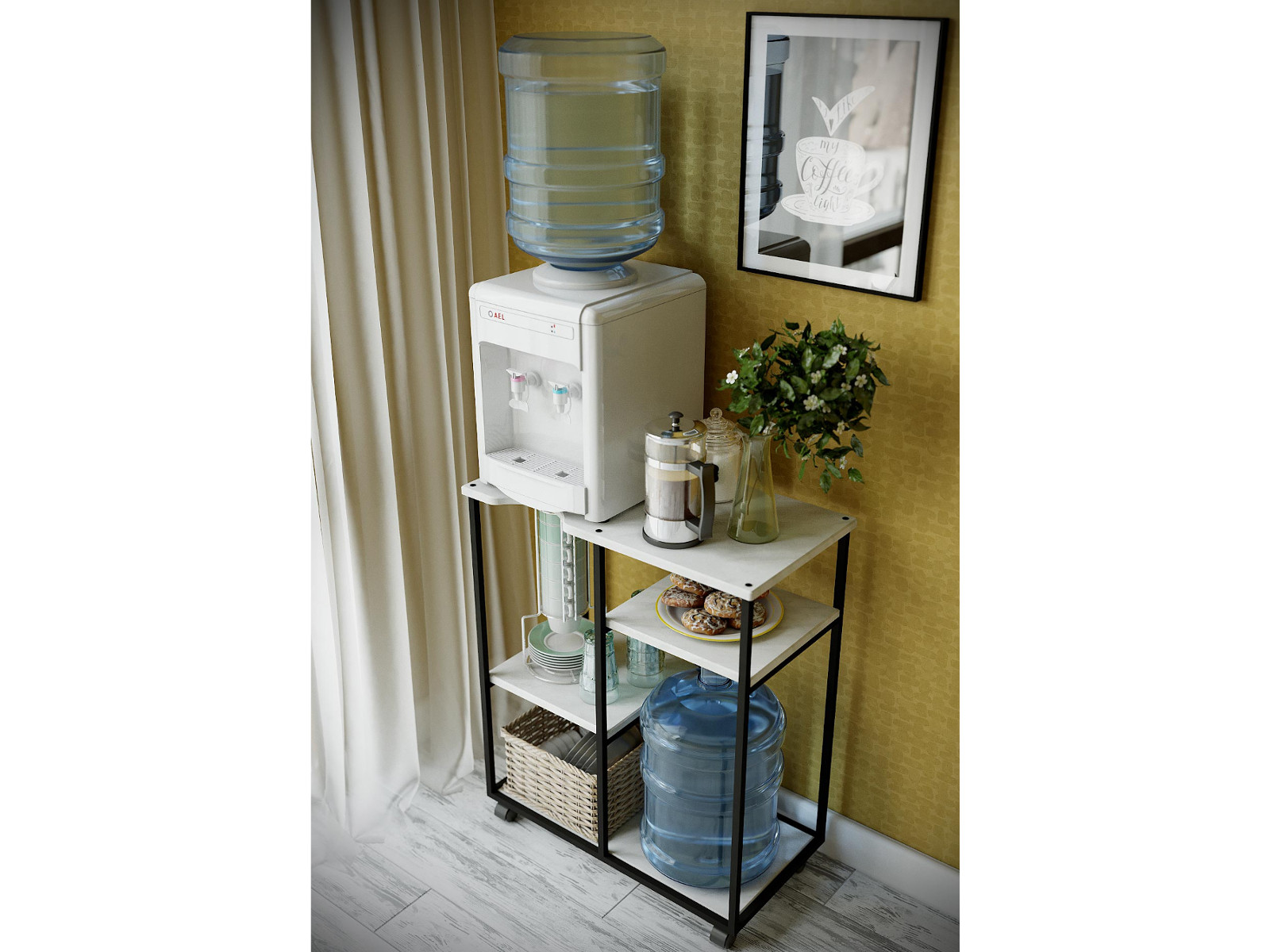 Сборно-разборный каркас подставки изготовлен из профильной трубы 15*15 мм, полки выполнены их экологичного материала МДФ. Данную подставку можно использовать и для кулера, и для бутыли, и сочетать бутыль с кулером и дополнительной бутылью, т.е. многофункциональность данной подставки позволяет использовать её как дома, в офисе или любом помещении для удобного и грамотного размещения воды. Основание подставки на роликовых опорах.