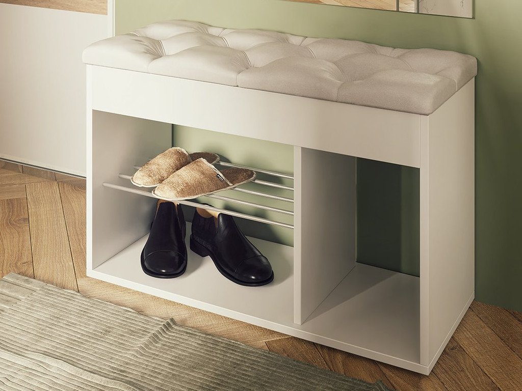 Удобный мягкий элемент и открытые ячейки делают её идеальной для небольшой прихожей. Основные ниши предназначены для кроссовок, туфель и тапочек, боковая же ниша — для более высокой обуви. А под откидной верхней крышкой — ниша для перчаток, зонтика, крема для обуви или других полезных мелочей, необходимых при выходе из квартиры.